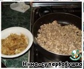 Мясо нарезать очень маленькими кубиками и обжарить, посолить, поперчить. Лук нарезать тонкими полукольцами и обжарить до золотистого цвета. Не смешивать.