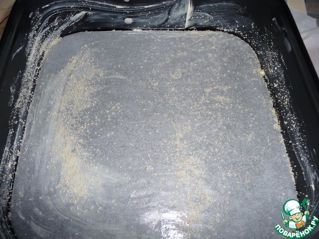 На дно формы выстелить пекарскую бумагу, смазать маслом, обсыпать панировочными сухарями. (у меня форма 24 х 24)