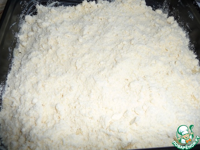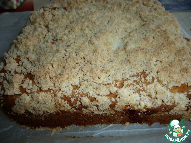 Готовим штрейзель. Мягкое масло, сахарную пудру и муку перетереть в крошку. Засыпать пирог штрейзелем.