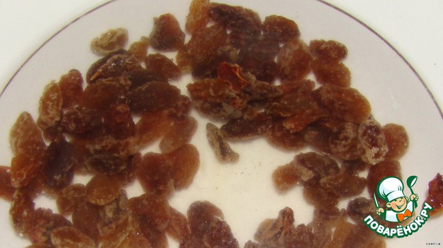 Изюм помоем зальём водой и оставим немного набухнуть