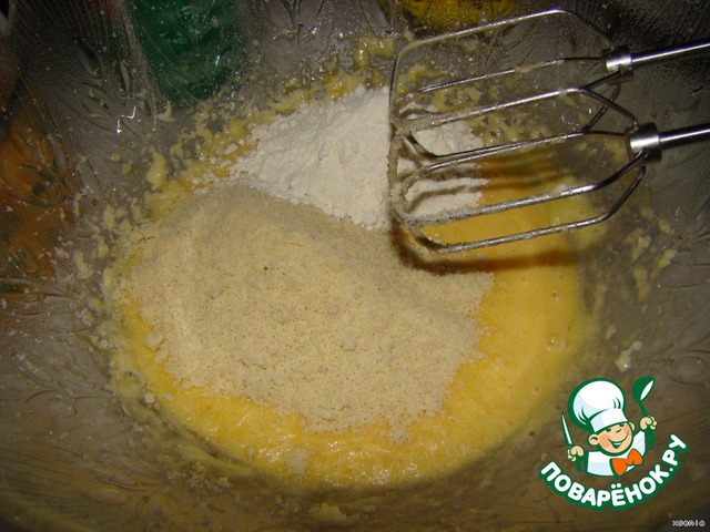Затем пудру миндального ореха и муку,перемешаем