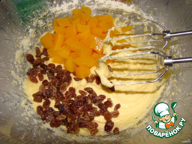 Затем изюм и фрукты...Перемешаем
