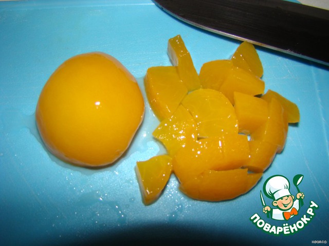 Если фрукты которые вы выбрали не порезанные порежем..Я взяла для пирога консервированные персики