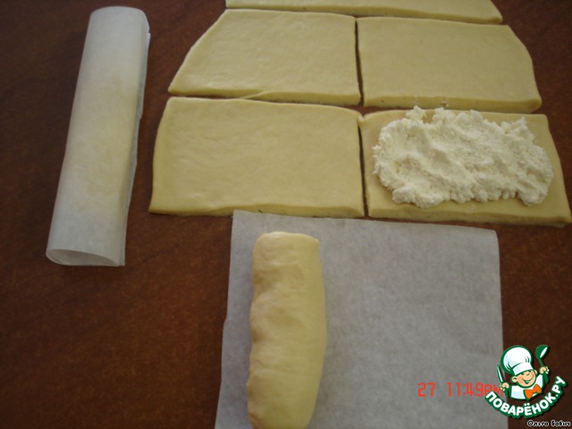 Раскатать лист, вырезать квадраты по 15 см, положить сыр, скрутить и завернуть в бумагу пекарскую.