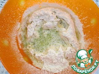 Муку просеять в миску, сделать углубление, добавить все ингредиенты для теста.