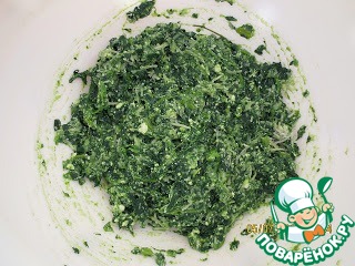 Шпинат помыть, отварить, слить воду, положить на салфетку. Затем мелко порезать, смешать с остальными ингредиентами для начинки, посолить, поперчить, перемешать.