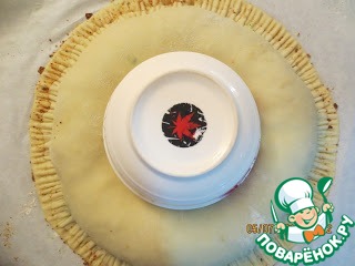 Затем выложить начинку так, как показано на фото, т. е. сделать ободок и внутри колобок.