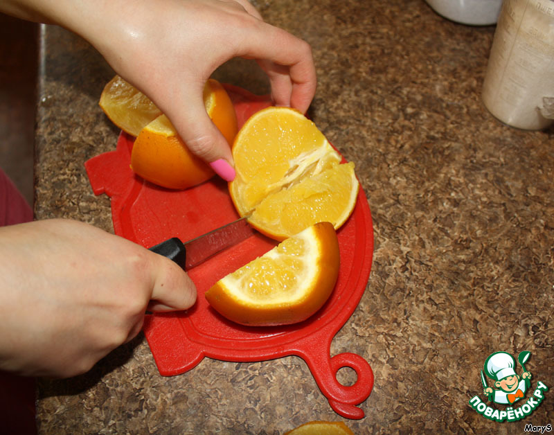 Соединить яйца и апельсиновую массу. Можно добавить разные ягоды: вишню, малину, смородину, все, что хотите. Залить эту массу в форму, поставить в духовку на 50-60 минут при температуре 180-200 градусов.