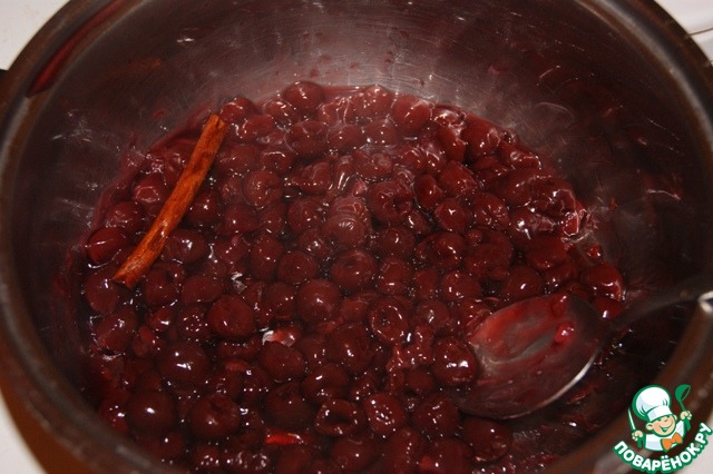 Вишню засыпать 60 г сахара, добавить корицу, поставить на огонь и варить 3-4 мин. Развести крахмал 6 г в 2 ст. л. холодной воды и влить в вишню, варить еще 2-3 мин. до загустения крахмала. Остудить. Корицу удалить.