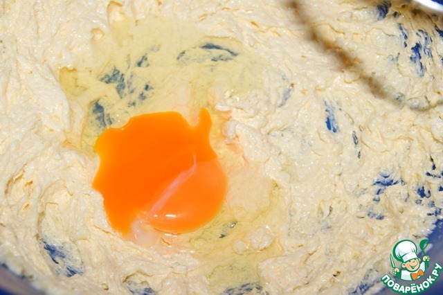 Тесто: Взбить 150 г мягкого сливочного масла с 100 г сахара. Не переставая взбивать, ввести по одному яйца. Добавить цедру и ваниль, перемешать.