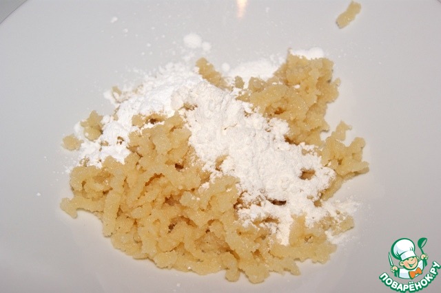 Разотрите натертый на терке марципан (ссылку на рецепт смотрите ниже) и перетрите его руками с 4 г муки и 4 г крахмала.