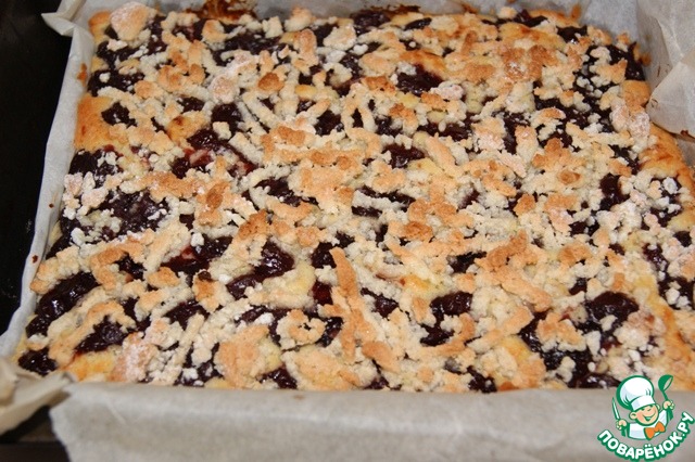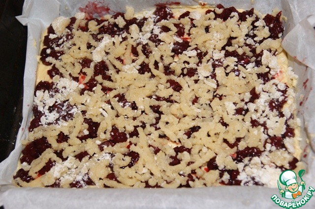 Выстелить тесто на противень 22х24 см застеленный пекарской бумагой. Обязательно оставьте длинными края бумаги - благодаря им вы легко освободите готовый пирог из формы. Сверху на тесто поместите остывшую вишню и посыпьте марципановой крошкой.