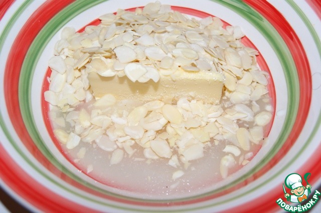 Топпинг: В СВЧ или на плите нагрейте 60 г сахара, 30 г масла, 60 г миндальных лепестков (или крупно рубленного миндаля) и молоко. Хорошо размешайте.