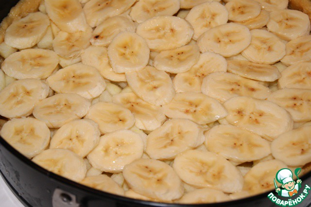 Заполнит яблоками нарезанными на кусочки и выстелить кусочками банана, которые выровняют поверхности.