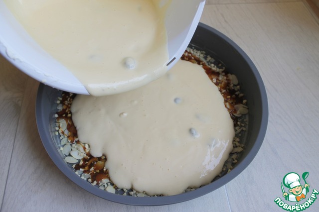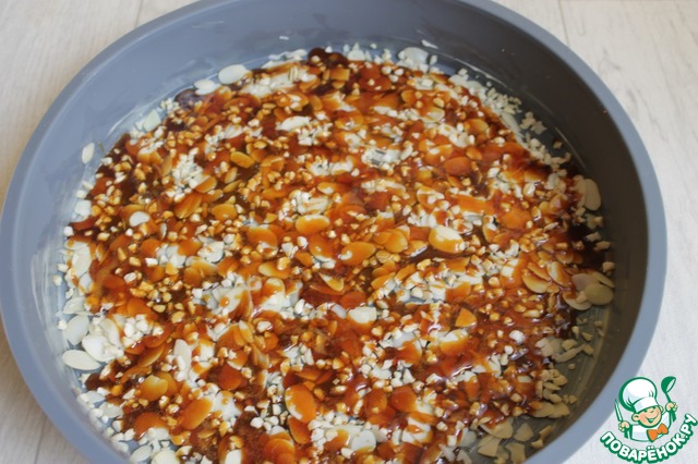 Теперь берем форму. У меня силиконовая 26см. Смажем ее маслом. И посыпем миндальными лепестками.