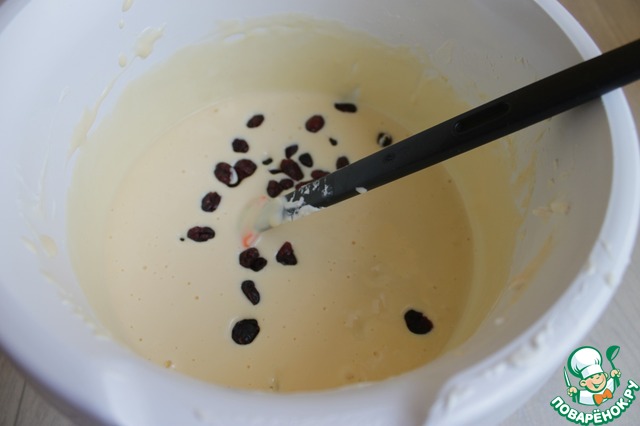 Для заливки смешаем творог, у меня пастообразный, с сахаром, ванильным пудингом, и сметаной. По одному добавим яйца не переставая взбивать. В конце добавляем изюм. Или как у меня вишня вяленая.