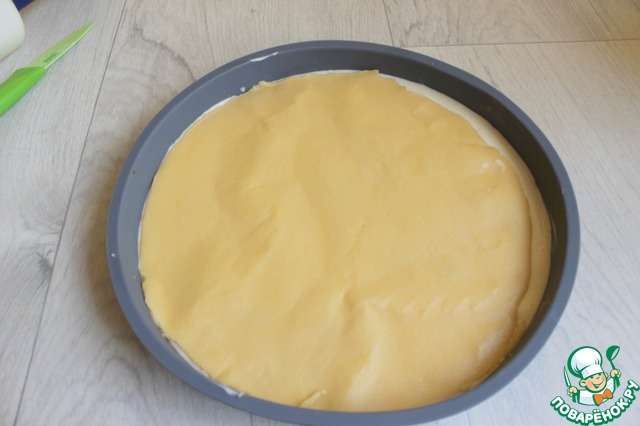 Тесто достаем из холодильника и раскатываем круг по диметру нашей формы. Для этого я взяла вырезала бумагу по кругу нашей формы. И на ней раскатала через пленку тесто. Оно не очень хорошо раскатывается на столе. И затем я удалила лишнее тесто. И переложила его на творог. Затем убрала бумагу