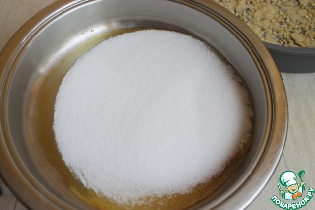 Делаем карамель. Сковородку нагреем, у меня с толстым дном. Насыпаем сахар и даем ему растопиться. В конце я его размешала.