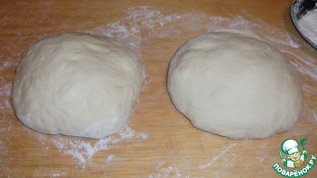 Готовое, подошедшее тесто обмять и разделить на 2 части. Прикрыть его полотенцем, и можно приступить к начинке.