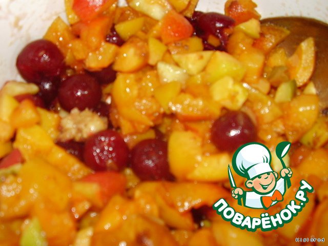 фрукты моем, нарезаем небольшими кубиками, у вишен удаляем косточку и смешиваем все с 1 столовой ложкой сахара