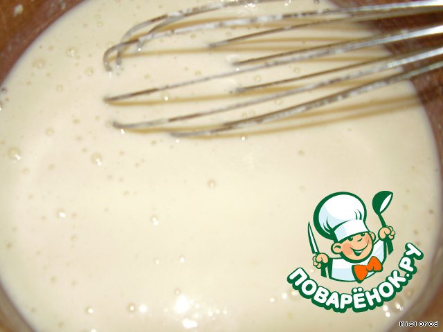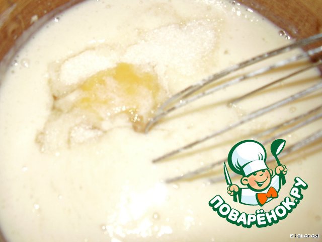 Делаем опару: в теплом молоке растворяем дрожжи, добавляем 2 столовые ложки сахара, немного муки и перемешиваем, накрываем полотенчиком и оставляем в теплом месте на 30 минут