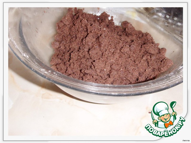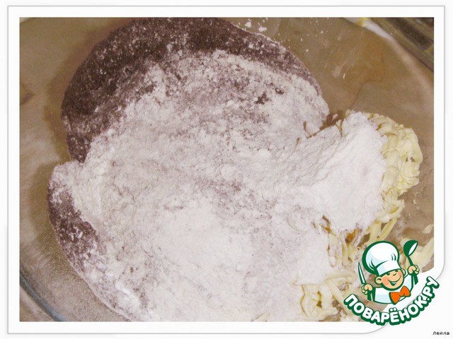 Mуку просеять, добавить разрыхлитель, какао.