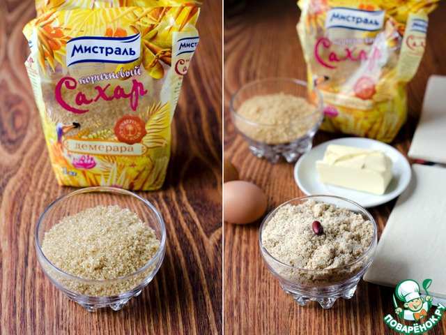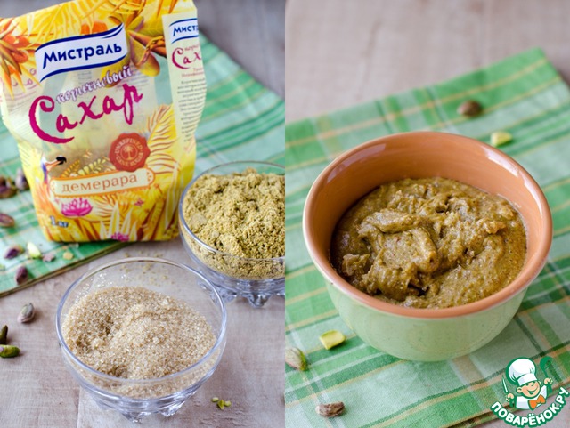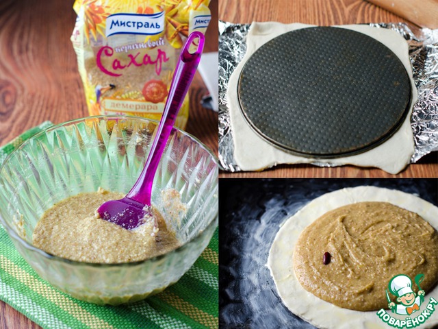Для этого пирога нам понадобится 100 г коричневого сахара марки "Мистраль", 500 г слоеного теста, 2 яйца, 100 г молотых несоленых фисташек, 1 ст. л. муки, 70 г мягкого сливочного масла, 1 фасолина или фигурка.