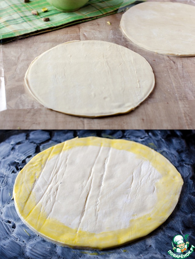 Слоеное тесто немного раскатать, вырезать два круга диаметром 26-28 см.