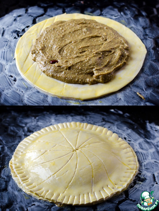 В середину теста выложить фисташково-масляную смесь, положить фасолину или фигурку, накрыть вторым слоем теста, хорошо разгладить, чтобы вышел воздух. Закрепить края, надавив немного по краю.