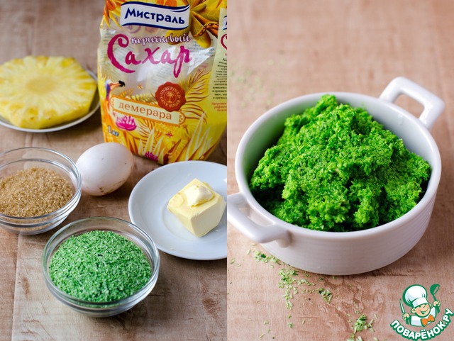 Для этого пирога нам понадобится 50 г коричневого сахара марки "Мистраль", 500 г слоеного теста, 1 яйцо, 60 г свежего ананаса, 60 г кокосовой стружки, 35 г мягкого сливочного масла и 1 фасолина или фигурка.