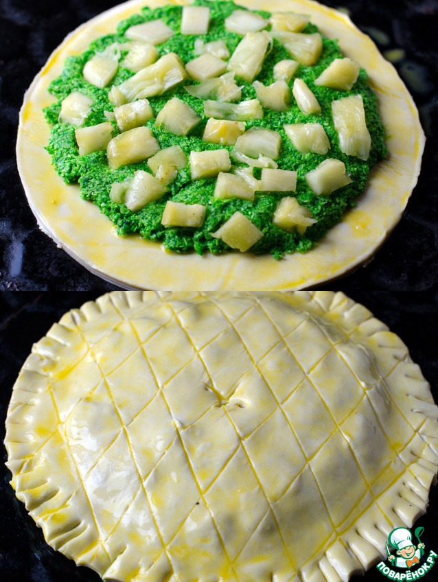 Накрыть вторым слоем теста, хорошо разгладить, чтобы вышел воздух. Закрепить края, надавив немного по краю.