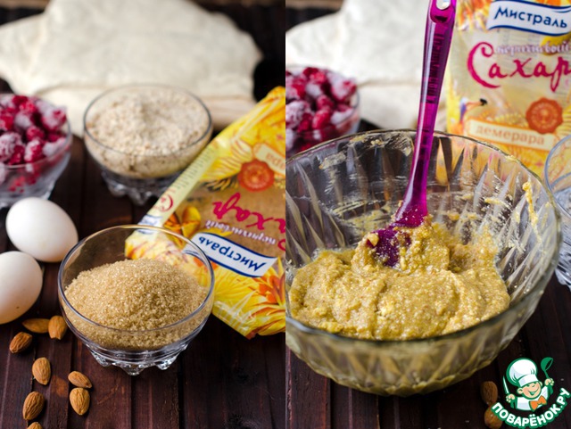 Для приготовления этого пирога нам понадобится 100 г коричневого сахара марки "Мистраль", 500 г слоеного теста, 2 яйца, 1 желток (для смазки), 1 ст. л. муки, 125 г молотого миндаля, 125 г замороженной малины, 70 г мягкого сливочного масла и 1 фасолина или фигурка.