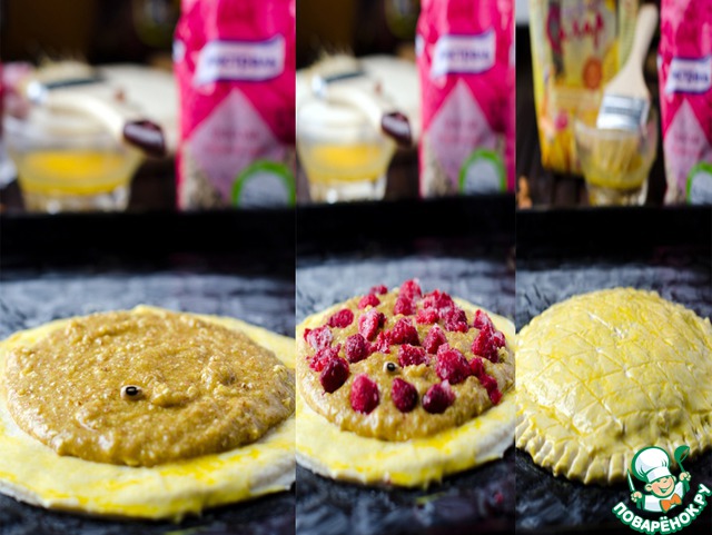 В середину круга выложить начинку из миндаля. Положить фасолину или фигурку. На начинку уложить малину.