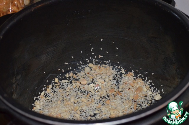 Форму или чашу мультиварки смазываем капелькой масла. Дно мультиварки посыпаем частью орехов. Если вы готовить будете в духовке- разогрейте ее до 190град.