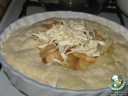 Перенести пирог в форму. На яблоки выложить немного тертого сливочного масла. Поставить в духовку минут на 30-35 при темп. 180-200 градусов.