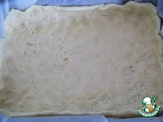 Немного больше половины теста кладем в не слишком большую смазанную маслом форму (я положила еще бумагу для выпечки, так удобнее вынимать), сформировав бортик.