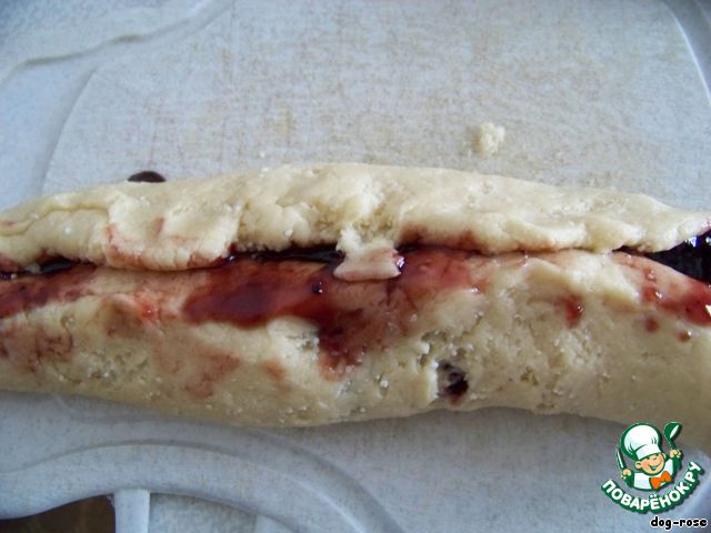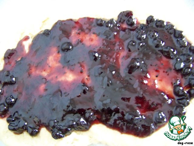 Оставшееся тесто раскатываем прямоугольником, смазываем вареньем.