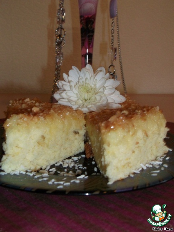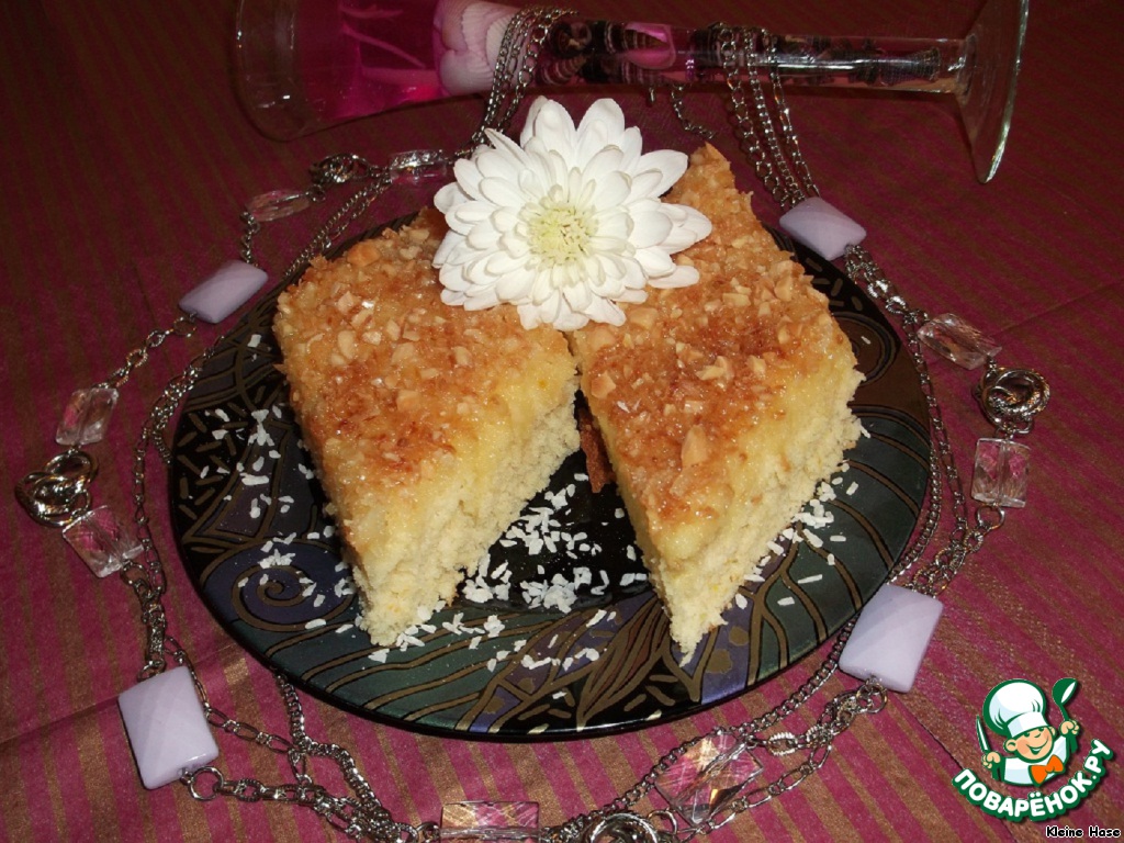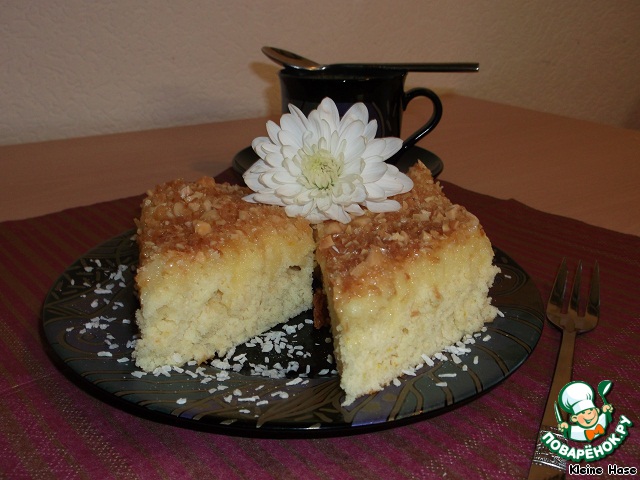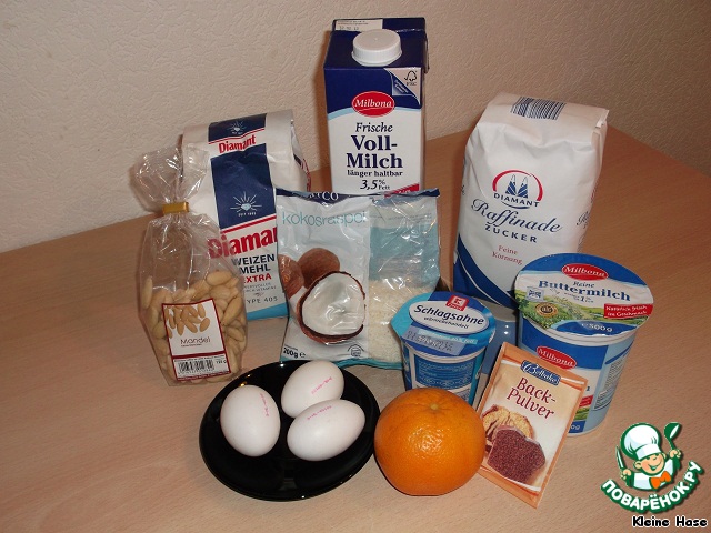 | Да-да, именно тeплый. В оригинальном рецепте пирог рекомендуется подавать тeплым, но, поверьте, и при остывании он ничем не уступает вкусовыми качествами своему первоисточнику. Нежный бисквит, хрустящая верхушка кокоса с орехами и тонкий вкус апельсина - ну чем не блаженство? Я приглашаю вас на этот замечательный десерт! Моим помощником выступил немецкий журнал "На каждый день" ( "Fuer jeden Tag"). |