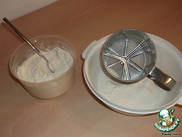 Муку и разрыхлитель соединяем и просеиваем через сито.