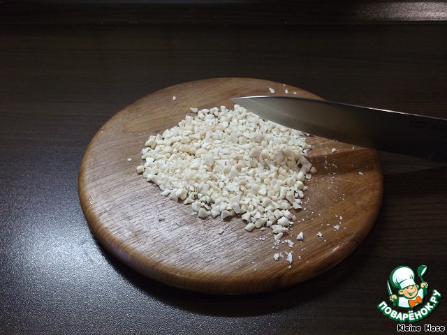 Очищенный миндаль рубим ножом, не в крошку, просто мелко. У меня был целый миндаль, уже очищенный. Если у вас такого нет, необходимо обычный миндаль залить кипятком на 10 минут, воду слить, кожицу снять, высушить, порубить. В данном рецепте предварительно подсушивать, прокаливать или обжаривать миндаль не нужно.