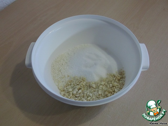 В отдельной посуде смешиваем 100 гр сахара и по 50 гр измельчённого миндаля и кокосовой стружки.