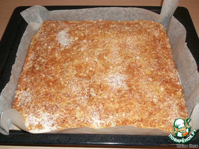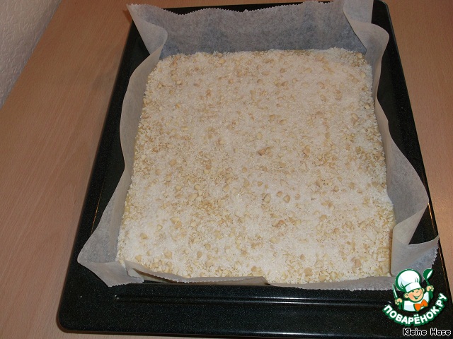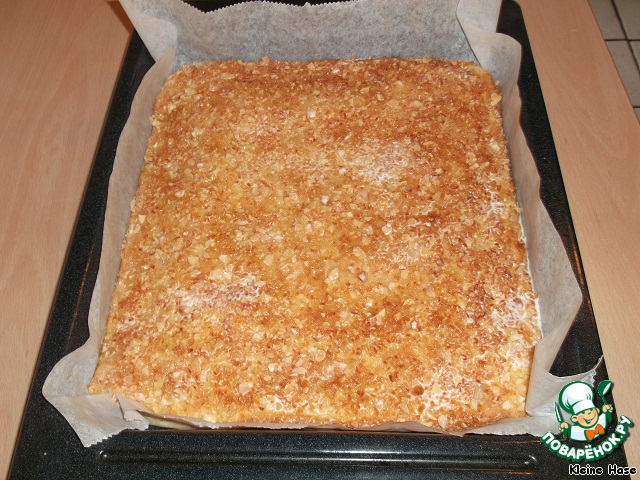 Тесто выливаем в застеленную бумагой для выпечки прямоугольную форму 30x40 см (у меня 30x27 по основанию).