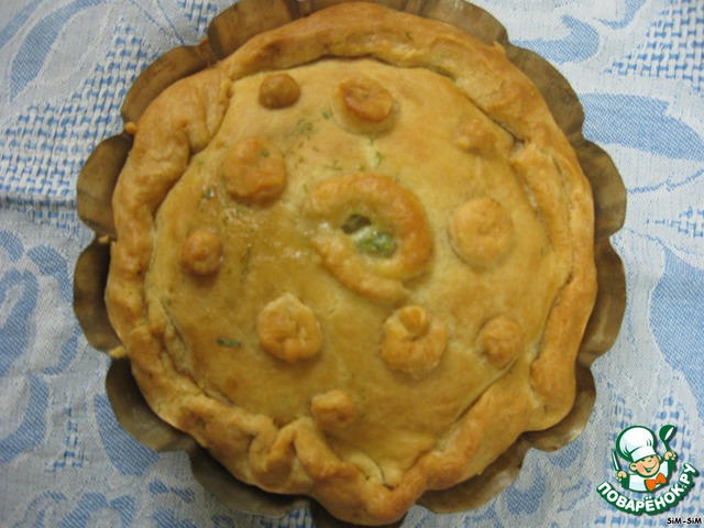 Сверху покрываем вторым раскатанным пластом и защипываем края, украшаем, смазываем яйцом, накалываем вилкой и ставим в разогретую духовку (огонь чуть больше среднего) мин. на 30-40.