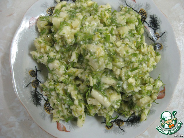 же трем охлажденное слив. масло, добавляем любую зелень, чеснок, приправы, яйцо и все хорошенько перемешиваем (попробуйте, добавьте по вкусу, чего не хватает).