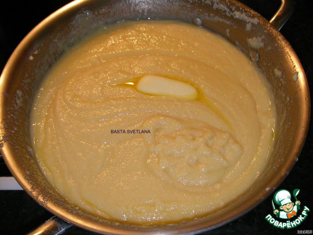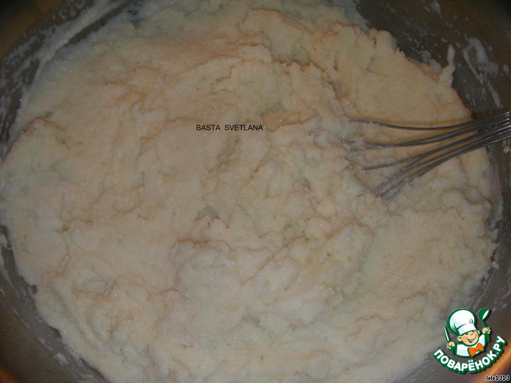 Всыпать потихоньку манную крупу, помешивать венчиком да загустения массы (я мешаю венчиком, чтобы не было комков)