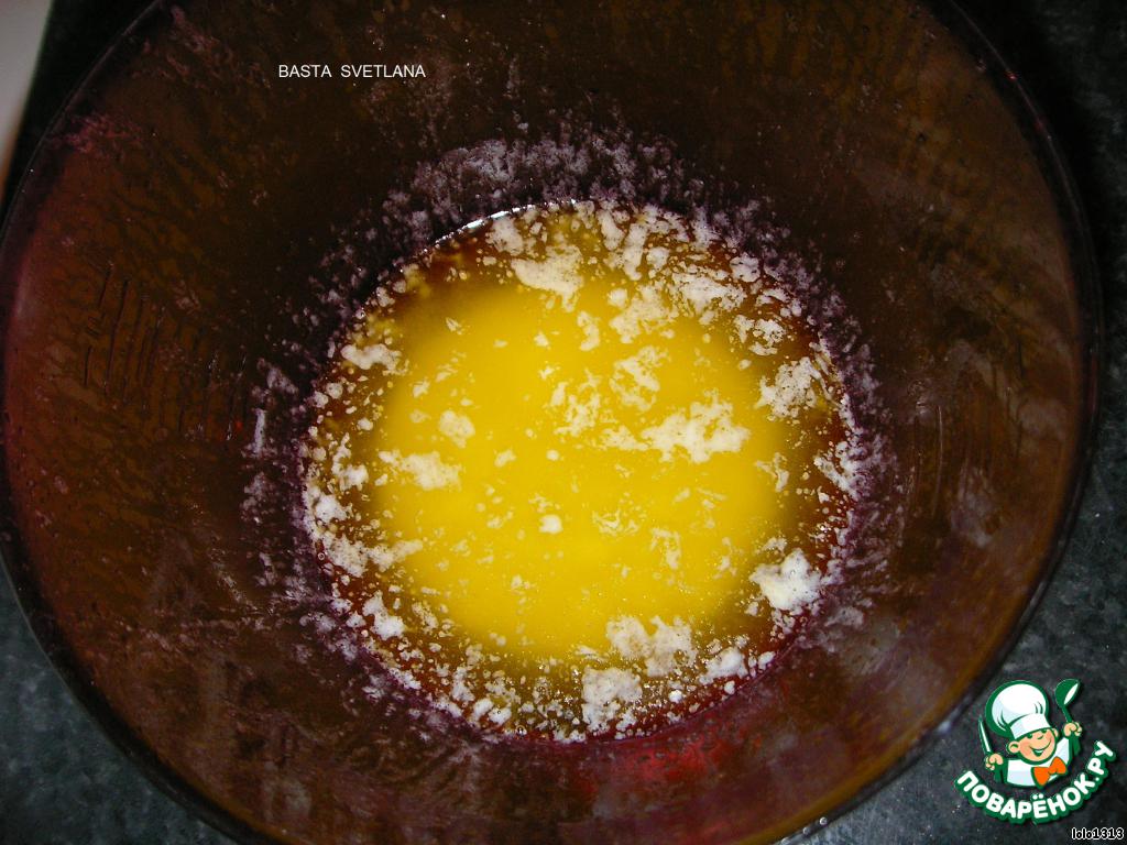Растопить сливочное масло, которым в дальнейшем мы будем смазывать наши пласты из вытяжного теста.