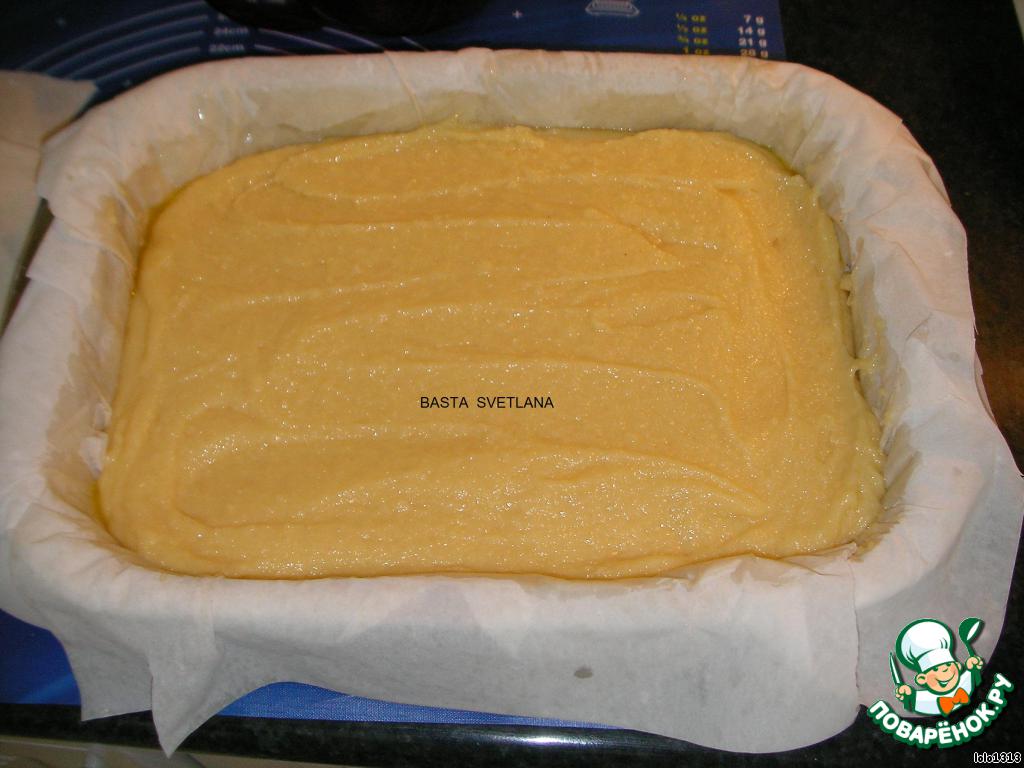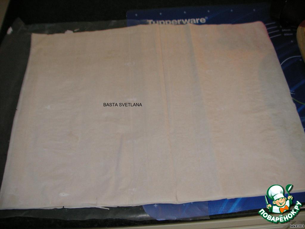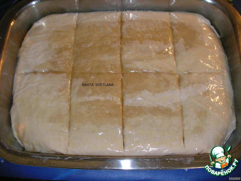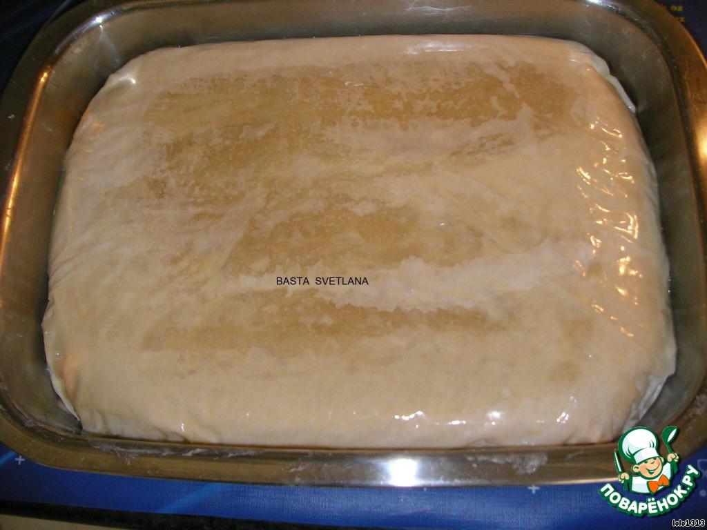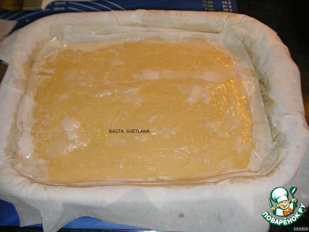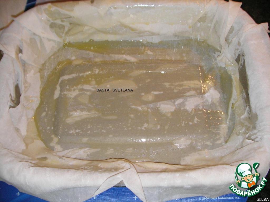 В форму выложить 7 пластов "филло", каждый лист смазывать маслом.