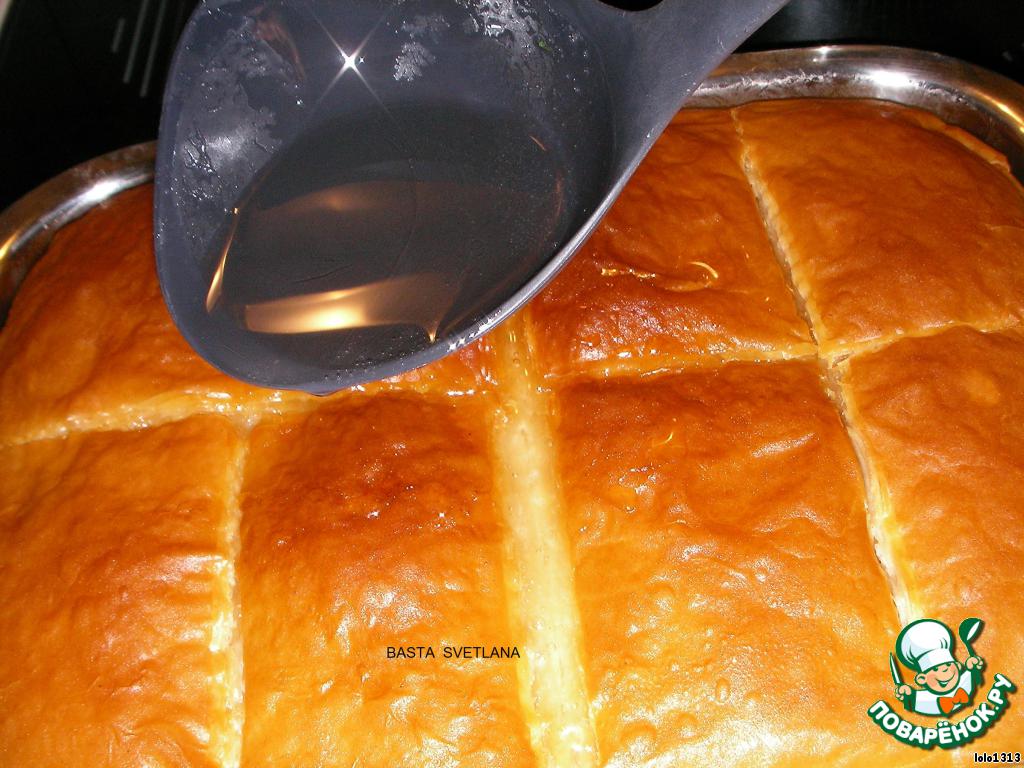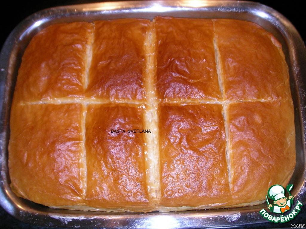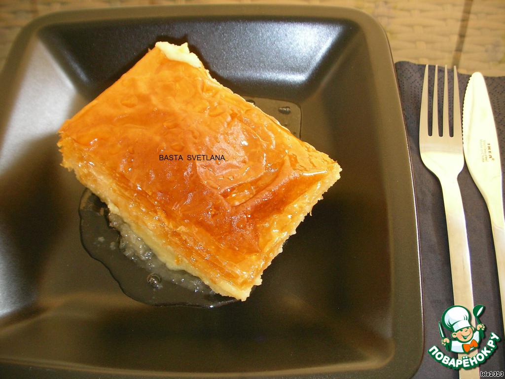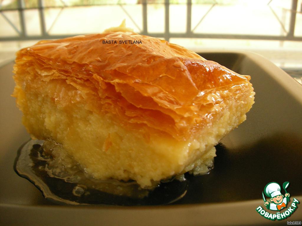 | Галактобуреко - сладкая греческая пита (пирог) с начинкой из сладкой манной каши и пропиткой из сахарного сиропа. Его обожают, буквально, все взрослые! Хочу отметить, что это очень сладкоооооо!!! |