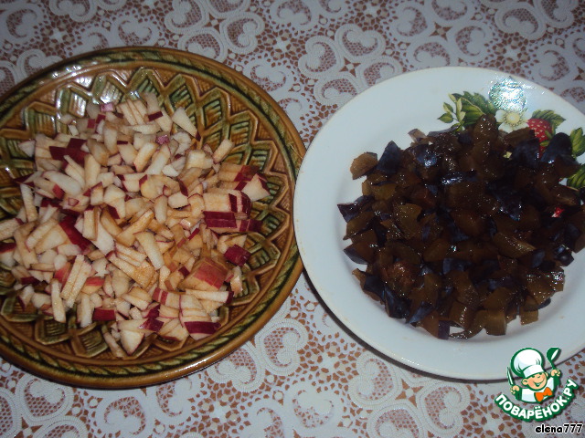 Пока подходит тесто - приготовим начинку. Яблоки очистить от семян, сливы - от косточек, нарезать на маленькие кусочки.