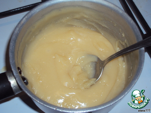 В оставшейся половине холодного молока (100мл) взбить 2ст.л. муки и тонкой струйкой влить в горячую карамельную массу, непрерывно помешивая. Варить до загустения, обязательно перемешивая постоянно, чтобы не было комков и масса не пригорела. Получается вот такой замечательный крем, с цветом сгущёного молока.